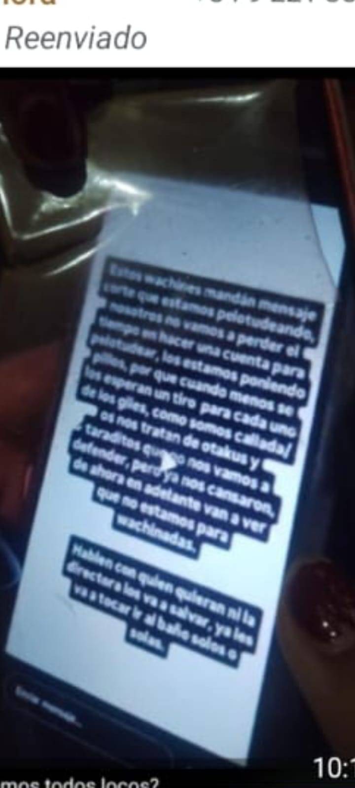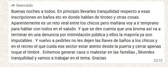 En paralelo, directivos de escuelas de la región buscaron llevar calma a las familias y al personal docente. En un mensaje interno, señalaron: “En principio llevarles tranquilidad respecto a esas inscripciones en baños en donde hablan de tiroteo. Aparentemente es un reto viral entre los chicos, pero vamos a trabajar en el tema y hablar con todos para que entiendan la gravedad”. En esa línea, advirtieron que “una broma así puede terminar en una denuncia por intimidación pública, y muchos alumnos ya son imputables”, al tiempo que pidieron reforzar controles internos, como restringir el acceso a baños y supervisar los recreos.