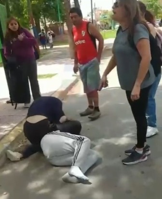 Difícil que se pueda ver algo peor en todo el día que esto. Una mujer, que sería auxiliar de una escuela en Ensenada, dejó que su hija (de azul) se peleara con otra alumna, ambas menores, mientras le recriminaba “dónde está tu mamá?”. También se la escuchó decir “sáquense las ganas” y otras barbaridades.